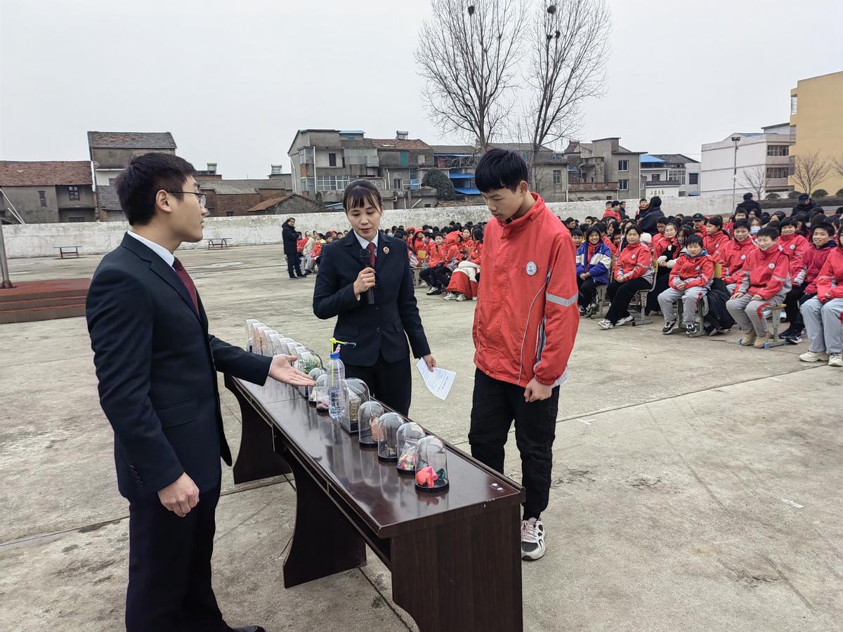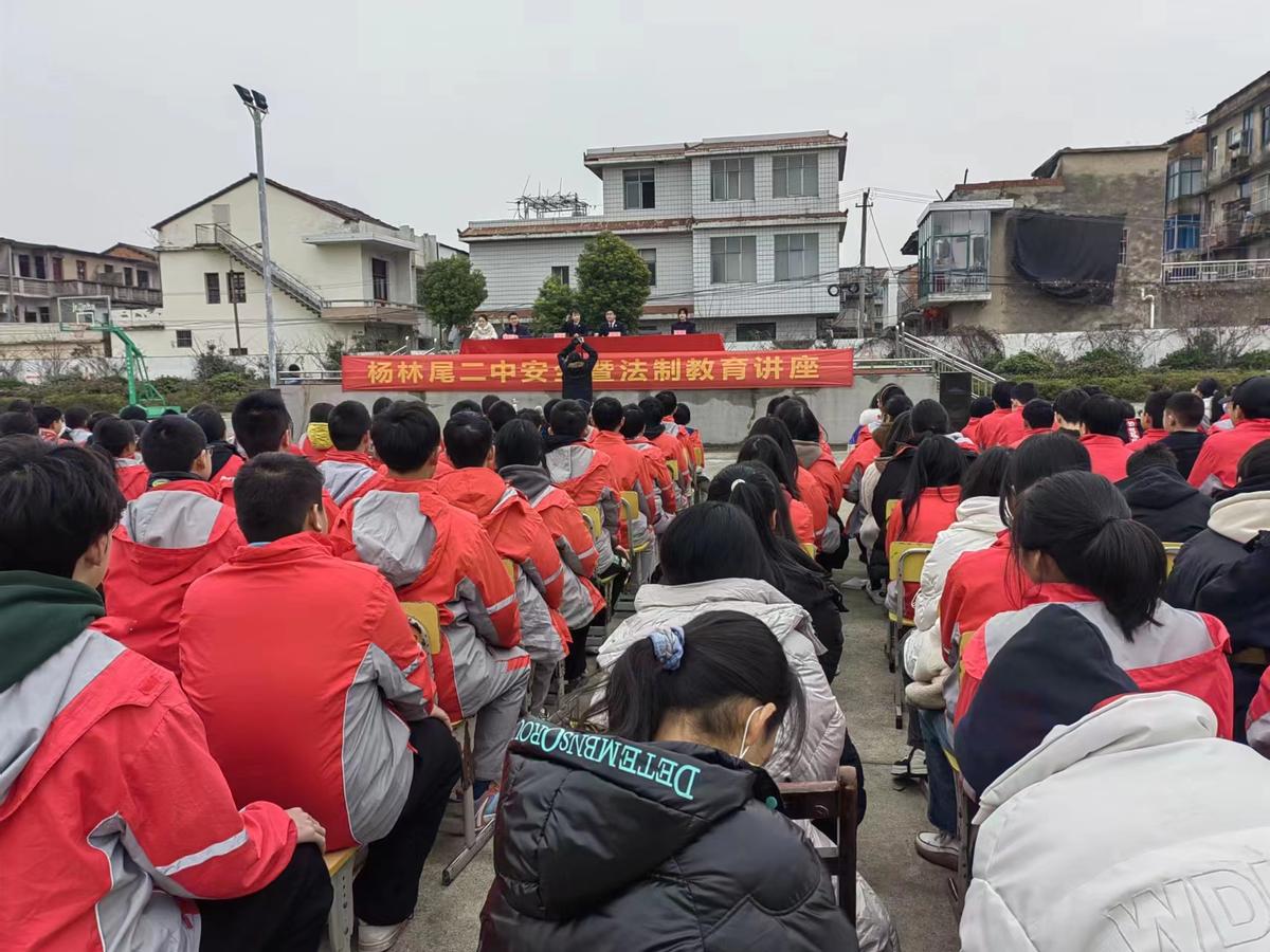 2月14日,仙桃市杨林尾镇第二中学校园内500多名学生们正被一场校园安全和法治课的精彩演讲吸引着,相互提问、答疑,案例宣讲、毒品识别、实物演示,每一个环节大家都带着好奇好学有问有答,有奖竞猜等多种互动形式,现场十分热闹。