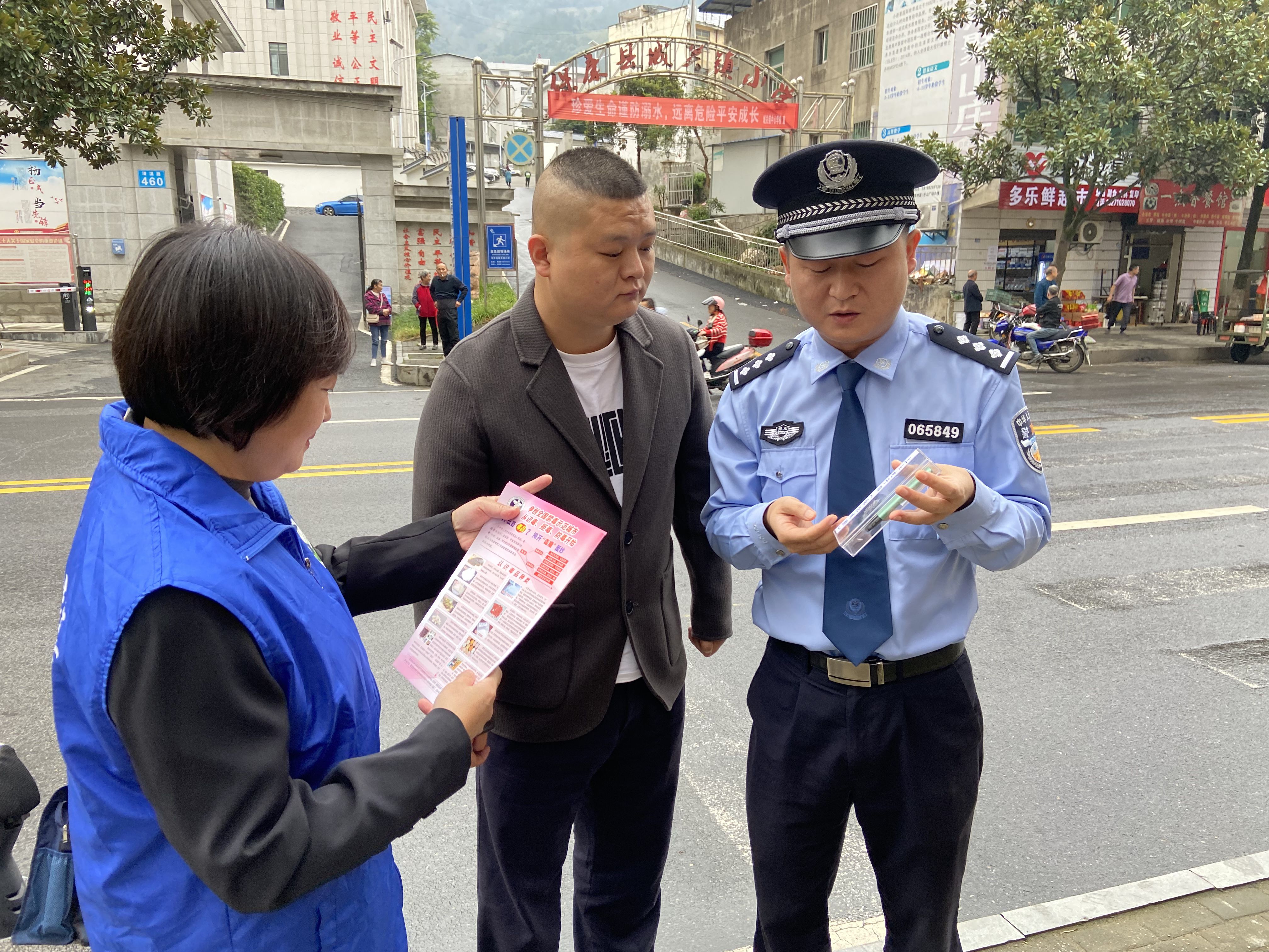 10月7日,“双节”过后首个工作日,保康县公安局禁毒民警和禁毒社工走上街头,进入商铺,向辖区群众开展禁毒宣传。