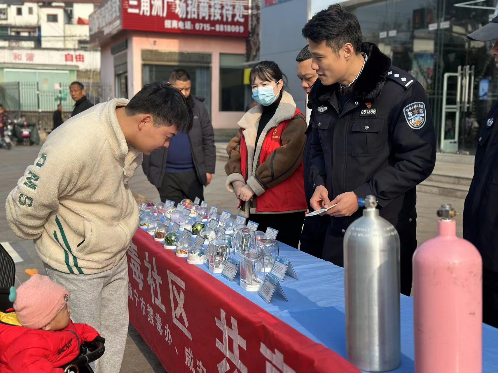 2024年1月9日上午,在第四个人民警察节来临之际,咸宁市公安局咸安分局禁毒大队组织永安派出所、永安街道办事处社区戒毒康复中心,在咸安区三角洲广场开展以“共庆中国人民警察节 共享绿色无毒人生”为主题的禁毒宣传活动,让禁毒意识深入人心,筑牢社会禁毒防线。