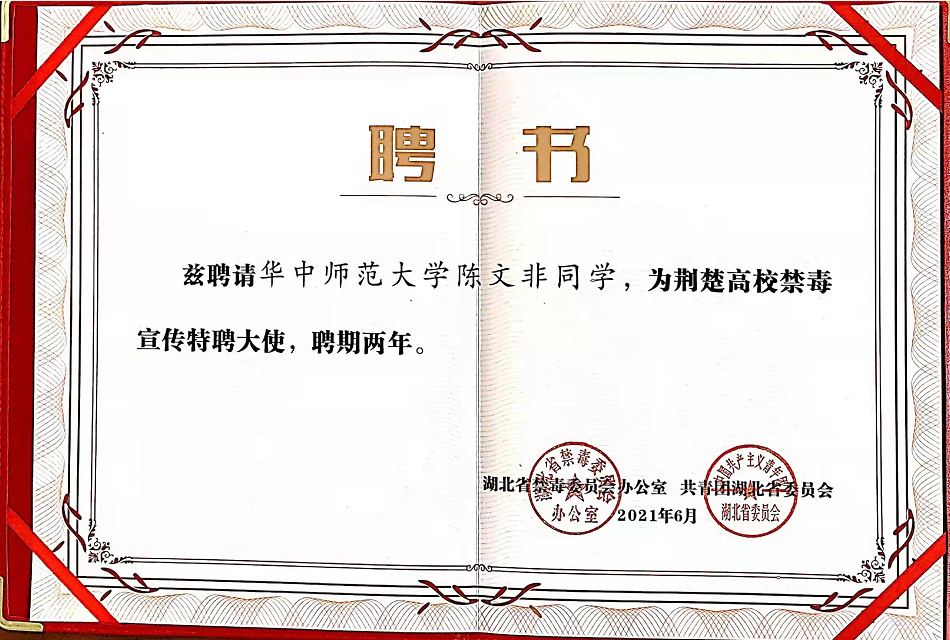 今年夏天,在湖北省6·26学校禁毒宣传教育展示活动中,荆楚高校禁毒宣传特聘大使带领全场许下禁毒誓言,这名身着蓝色连衣裙的领誓员陈文非来自华中师范大学,是荆楚高校禁毒宣传特聘大使。