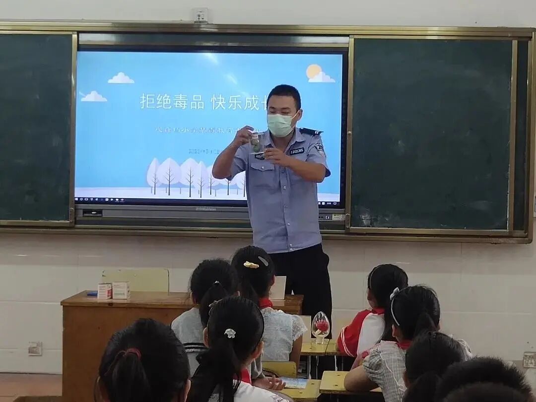 朗朗金秋,荆州沙市区观音垱镇政法办、司法所联合镇派出所民警走进观音垱小学,为在校学生们上了一堂生动的禁毒反诈主题教育课。