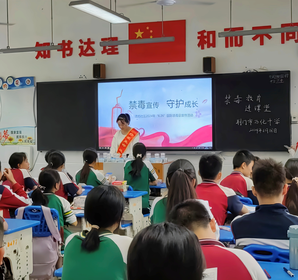 6月18日上午,荆门市掇刀区白庙街道社区戒毒康复中心联合白庙派出所及牌坊社区工作人员,一同对辖区内石化中学在校学生开展以“6.26国际禁毒日禁毒教育进课堂”为主题的校园法治教育宣传活动。