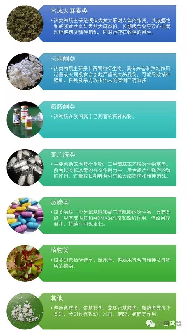 新精神活性物质蔓延的风险加大。2015年,全国破获制造冰毒晶体案件484起、氯胺酮案件118起,同比分别上升17.2%和12.4%。——《2015年中国毒品形势报告》NPS主要分类吸食NPS的效果与毒品一样,是物质作用于人体中枢神经引发兴奋、致幻等,大剂量服用与毒品无异。由于NPS变化多端,更新很快,绝大多数NPS并未被列管,其制造者、贩卖者相当于钻了法律的空子。法网恢恢,疏而不漏,随着列管目录的快速更新,他们最终还是逃不脱惩罚。