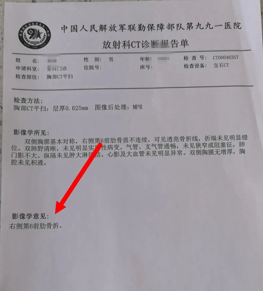 抓捕完毕后,同事让王涛去医院检查。他却说:“等审讯完,我再去。”当他第二天去医院检查时,被诊断为“右侧第6前肋骨折。