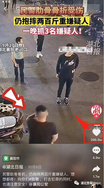 当晚20时许,专案组掌握到新情况,另一名贩毒人员即将在樊城区人民路某处进行毒品交易,刚刚受伤的王涛强忍伤痛继续参与抓捕行动。20时24分,侦查员赶到时,该贩毒人员察觉有异常正欲逃离,王涛同志趁其不备上前将其抱摔在地成功进行控制,上演了视频中令人惊讶的一幕。