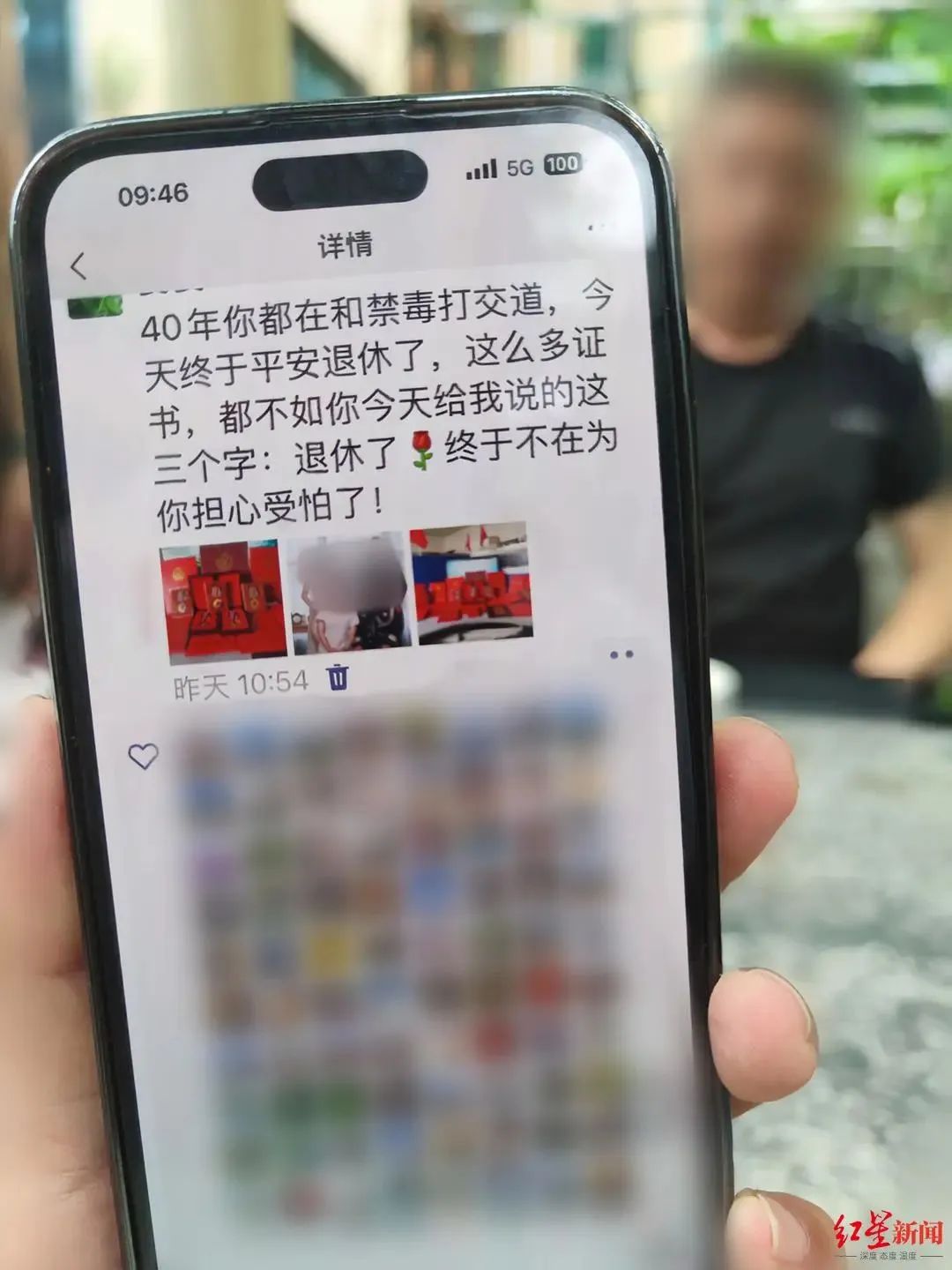 对于老肖来说,2023年7月20日,是一个值得纪念的日子,这天是他60岁生日,也是他退休的日子。上午,妻子曾女士陪着老肖办理了退休手续,帮他整理相关物品,间隙里,曾女士发了一条微信朋友圈,表达了对丈夫退休的内心感受,“40年你都在和禁毒打交道,今天终于平安退休了……这么多证书,都不如你今天给我说的这三个字:退休了。终于不在(再)为你担心受怕了。”